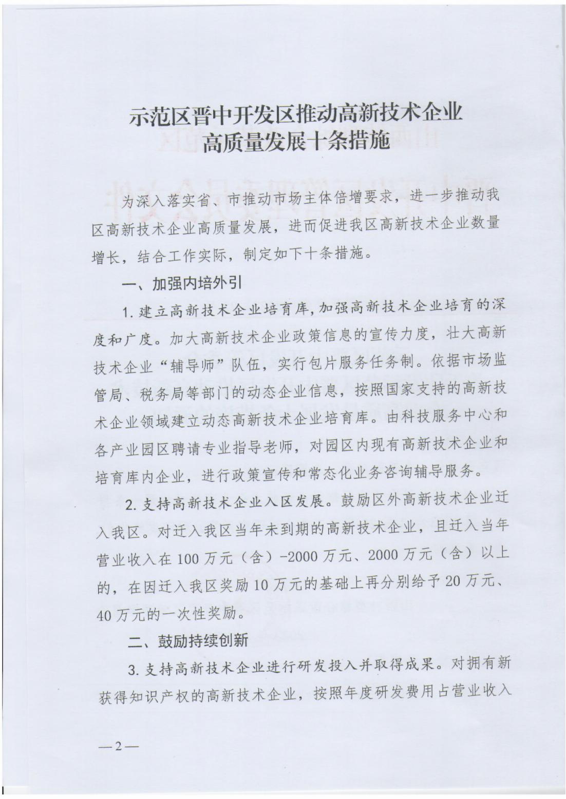 關(guān)于印發(fā)示范區(qū)晉中開(kāi)發(fā)區(qū)推動(dòng)高新技術(shù)企業(yè)高質(zhì)量發(fā)展十條措施的通知